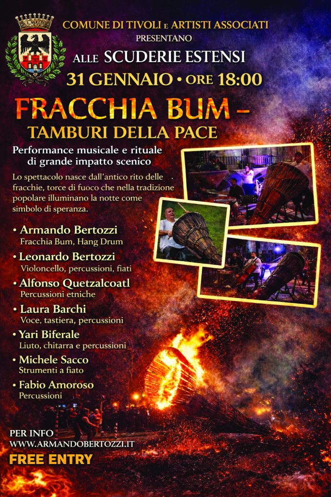 TIVOLI - Una serata dove la tradizione popolare incontra la sperimentazione sonora, trasformando il rito antico in un messaggio universale di speranza. Il prossimo 31 gennaio, alle ore 18:00, le storiche Scuderie Estensi ospiteranno “Fracchia Bum – Tamburi della Pace”, una performance musicale e rituale presentata dal Comune di Tivoli e Artisti Associati.