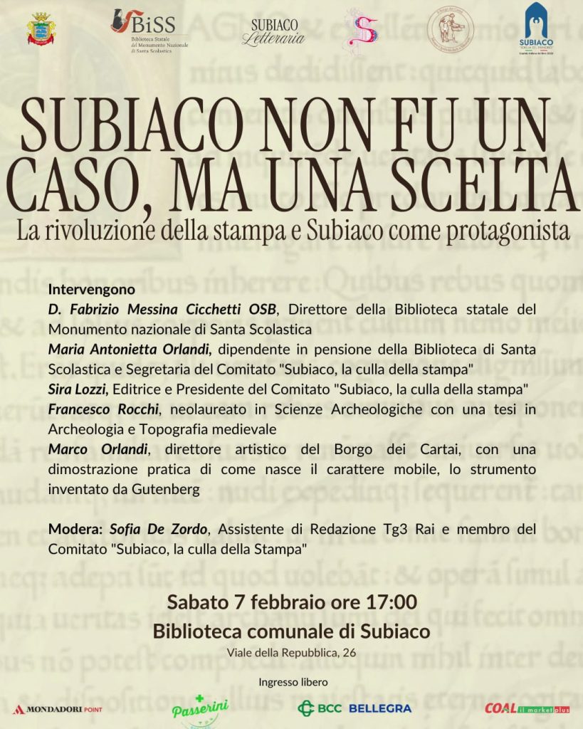 L’iniziativa è organizzata in collaborazione con il Comitato “Subiaco, la culla della stampa”, con la partecipazione della Biblioteca di Santa Scolastica e de Il Borgo dei Cartai, realtà impegnate nella tutela e nella valorizzazione di un patrimonio storico spesso poco conosciuto, soprattutto dalle nuove generazioni.