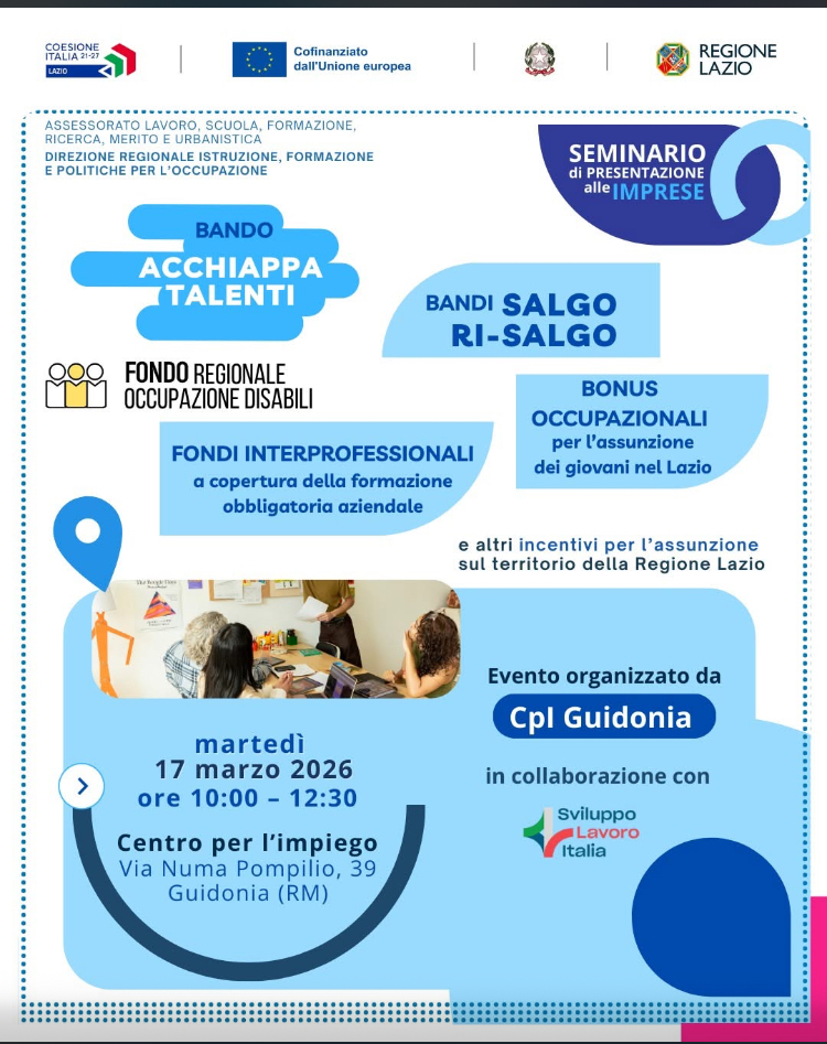 Il Centro per l’Impiego di Guidonia organizza un seminario informativo dedicato alle imprese del territorio per presentare gli incentivi e le opportunità previste dalla Regione Lazio a sostegno dell’occupazione. L’iniziativa nasce dalla collaborazione con Sviluppo Lavoro Italia e ha l’obiettivo di favorire l’incontro tra aziende e nuove risorse professionali.