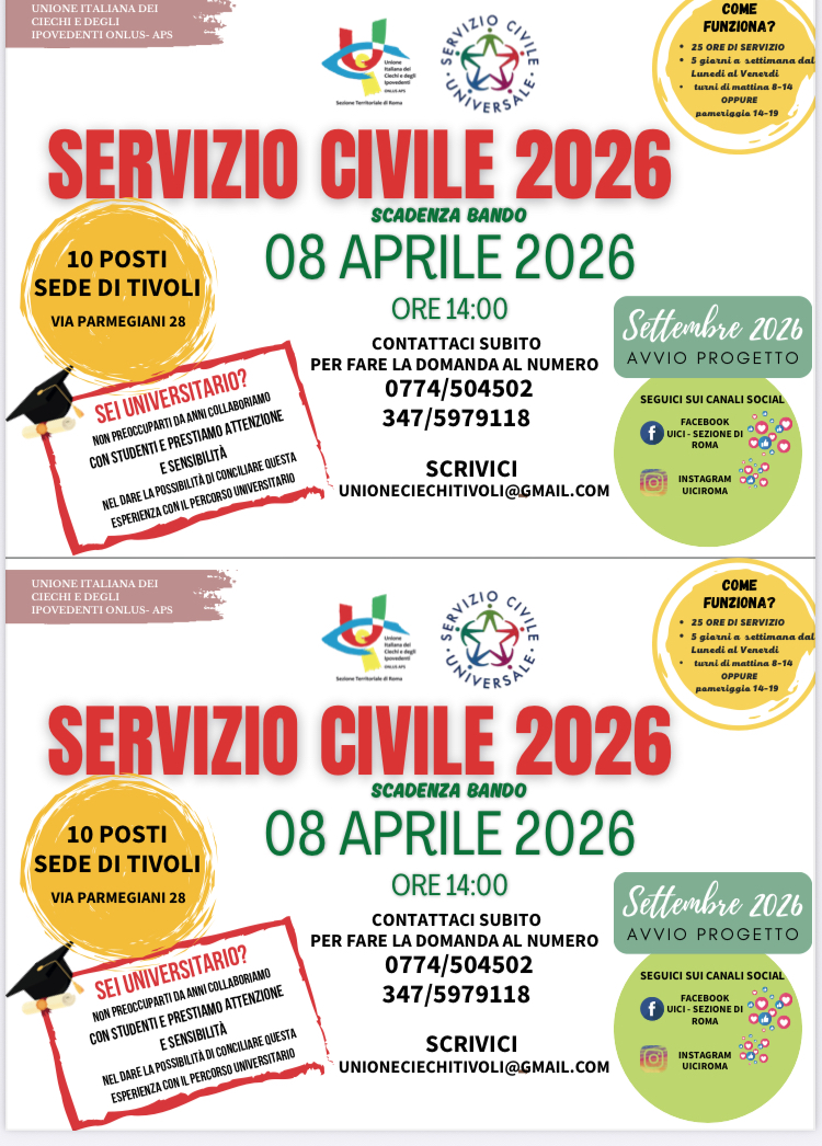 L’Unione Italiana Ciechi e Ipovedenti di Tivoli cerca 10 giovani (18-28 anni) per i progetti di Servizio Civile Universale 2026. Un’opportunità di crescita dedicata alla solidarietà e all’inclusione.