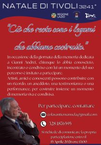 A Tivoli, nell’ambito del “Natale di Tivoli 3241°”, è stata promossa un’iniziativa dedicata alla memoria di Gianni Andrei, con l’obiettivo di costruire un momento collettivo di ricordo e condivisione.