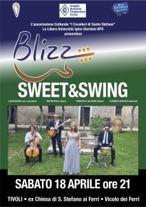Sabato 18 aprile, per la rassegba Blizz alle ore 21, sarà Sweet & Swing a salire sul palco, allestito nell’abside della suggestiva ex chiesa di Santo Stefano ai Ferri, a Tivoli, per un concerto che si preannuncia di grande fascino musicale e ambientale.