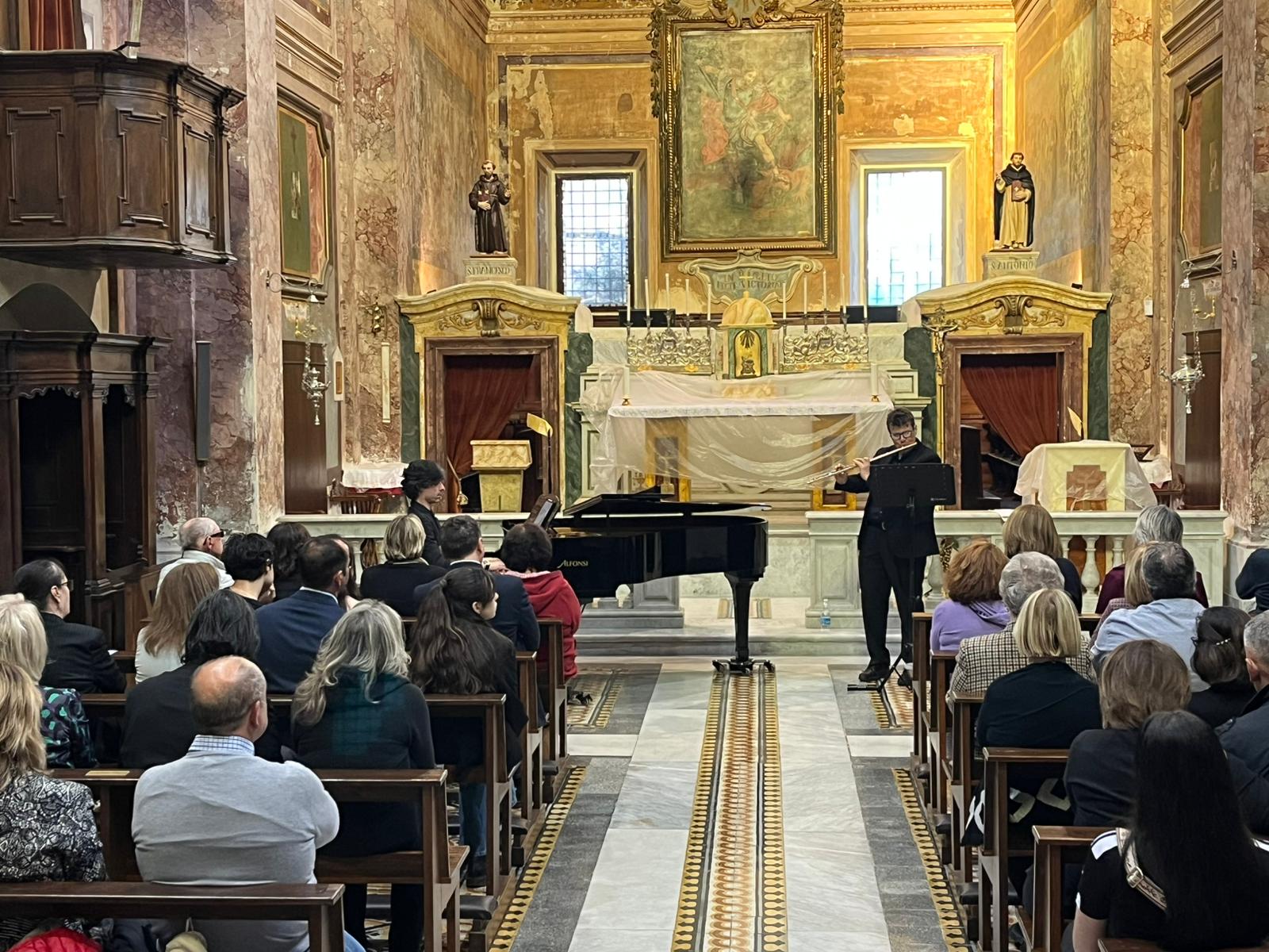 La scelta dell’organizzazione di dare spazio alle nuove generazioni si è rivelata, ancora una volta, una scommessa vinta. Il fulcro dell’evento ha visto protagonisti il flautista Luca Magni e il pianista Davide Martelli. Il duo ha instaurato un dialogo sonoro vibrante, caratterizzato da un’intesa quasi telepatica. Luca Magni ha incantato la navata con una sonorità di flauto pastosa e ricercata, capace di passare da agilità brillanti a momenti di profondo lirismo mentre Davide Martelli ha fornito un sostegno pianistico magistrale, mai puramente accompagnatorio, ma sempre ricco di sfumature dinamiche e colori orchestrali.