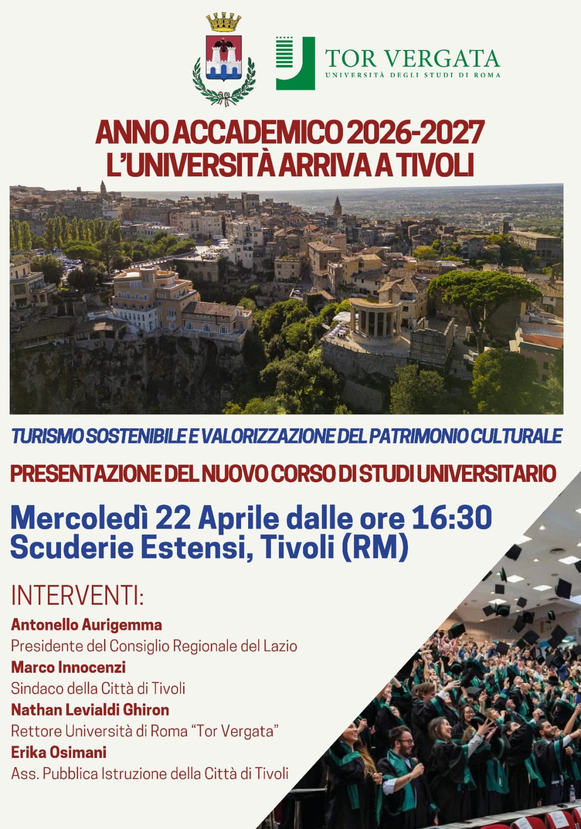 Tivoli si prepara ad accogliere una nuova importante iniziativa formativa nel campo del turismo e della cultura. Mercoledì 22 aprile, a partire dalle ore 16:30, presso le Scuderie Estensi, si terrà la presentazione ufficiale del nuovo corso di studi universitario in “Turismo sostenibile e valorizzazione del patrimonio culturale”, promosso dall’Amministrazione Comunale in collaborazione con l’Università degli Studi di Roma Tor Vergata.