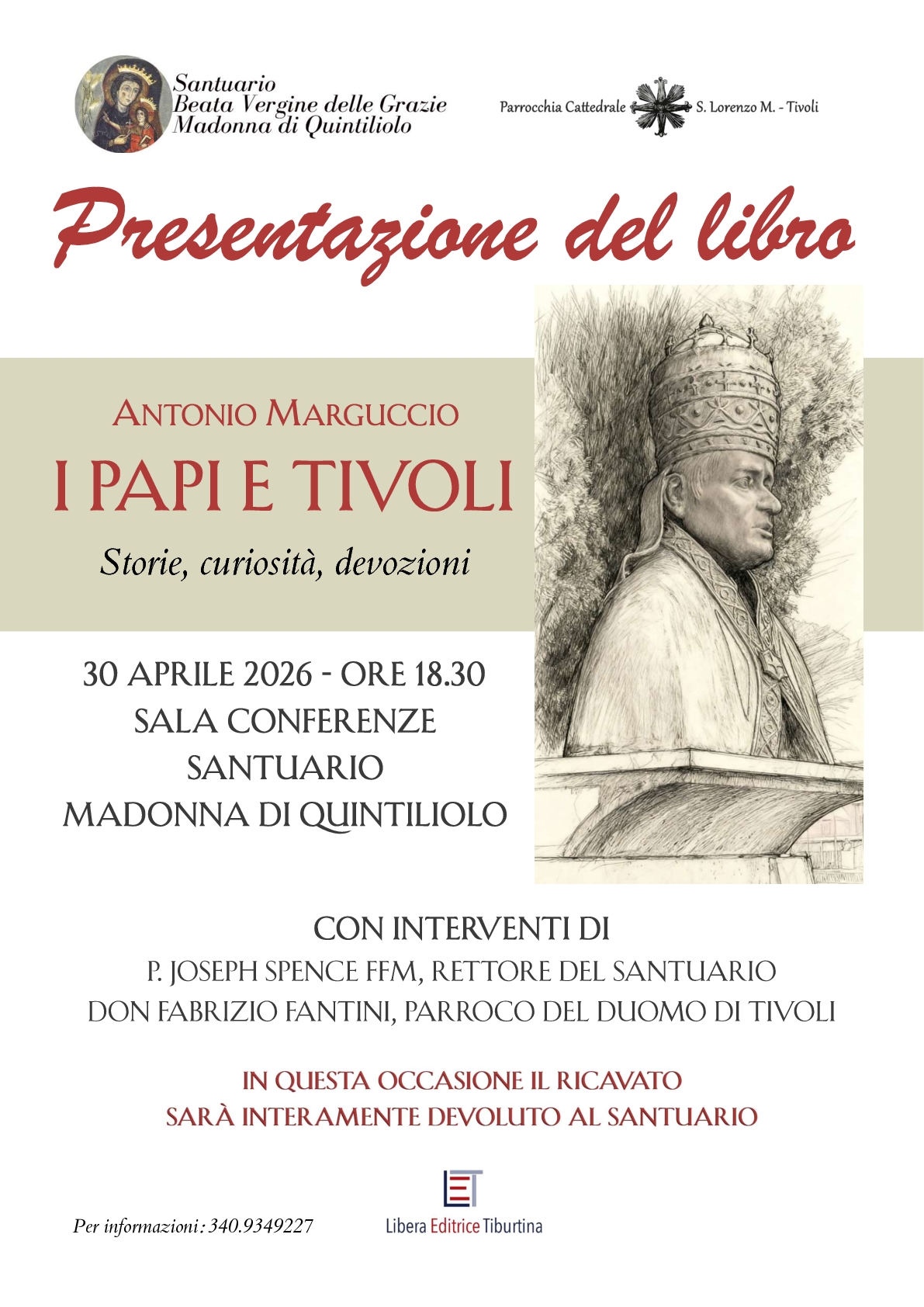 Il Santuario Beata Vergine delle Grazie Madonna di Quintiliolo e la Parrocchia Cattedrale San Lorenzo Martire invitano alla presentazione del libro I Papi e Tivoli di Antonio Marguccio (Libera Editrice Tiburtina, pagine 200), un volume che racconta i numerosi e stretti legami storici e religiosi tra la nostra città e i Sommi Pontefici, da San Pietro ai nostri giorni.