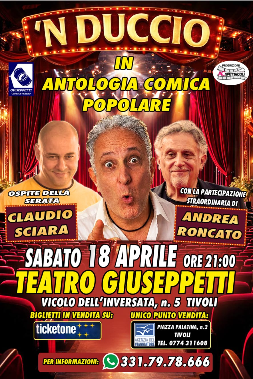 Una serata all’insegna della comicità e della tradizione teatrale attende il pubblico di Tivoli. Sabato 18 aprile, alle ore 21:00, il palcoscenico del Teatro Giuseppetti ospiterà lo spettacolo “’N Duccio in Antologia Comica Popolare”, un appuntamento imperdibile per gli amanti del cabaret e della risata genuina.