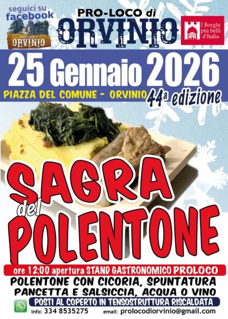 23 Gennaio 20261 Minuto di letturaSagra del Polentone di Orvinio Ad Orvinio, al caldo di una tensostruttura coperta, si potrà degustare il polentone con cicoria, spuntature, pancetta e salsicce. La 44° Sagra…